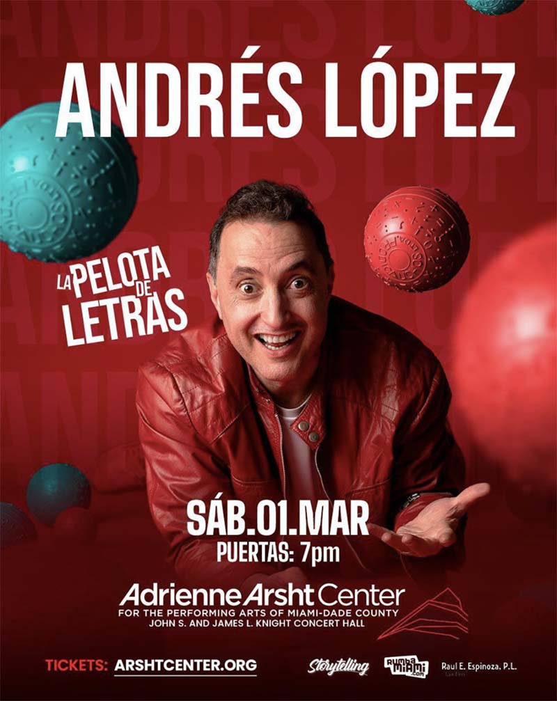 Dos décadas después de haber cambiado para siempre la manera en que el humor conecta con las generaciones, La Pelota de Letras de Andrés López llega al Adrienne Arsht Center for the Performing Arts of Miami-Dade el sábado 1 de marzo de 2025 a las 7:30 PM.