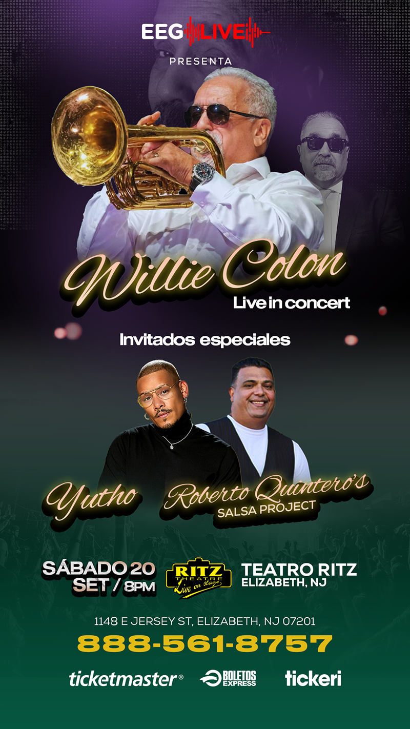 La leyenda viva de la salsa, Willie Colón, regresa a los escenarios del área tri-estatal con un espectáculo imperdible, una noche histórica para celebrar la música latina, acompañada de artistas invitados de primer nivel en una producción de alto nivel a cargo de EEGLIVE, una oportunidad única para disfrutar en vivo de sus más grandes éxitos.