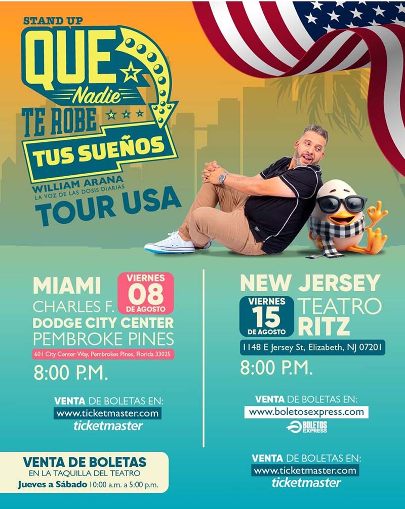 William Arana, una de las voces más reconocidas del mundo hispano, llega por primera vez a Estados Unidos con su aclamado show Que Nadie Te Robe Tus Sueños, después de presentarse ante más de 200 mil personas en distintas ciudades de América Latina. Esta semana, Arana fue reconocido por Spotify Colombia con el primer Milestone Creator Award por alcanzar 50 millones de reproducciones, posicionando su podcast, La Dosis Diaria, como el más escuchado en todo el país. Las fechas confirmadas: viernes 8 de agosto en el Charles F. Dodge City Center de Pembroke Pines (Miami) y el viernes 15 de agosto en el Teatro Ritz de New Jersey.